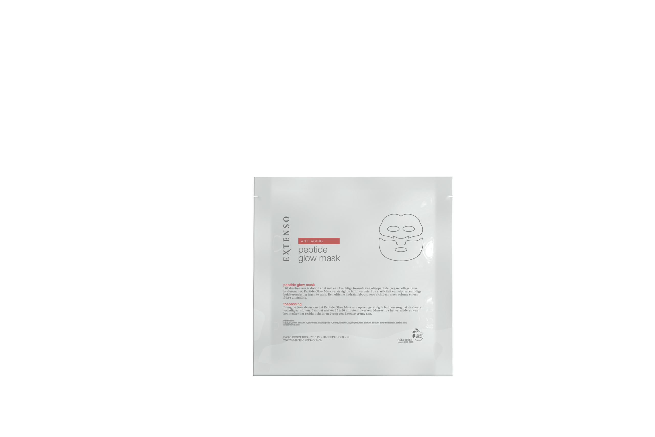 Breng de twee delen van het Peptide Glow Mask aan op een gereinigde huid en zorg dat de sheets volledig aansluiten. Laat het masker 15 à 20 minuten inwerken. Masseer na het verwijderen van het masker het residu licht in en breng een Extenso crème aan.