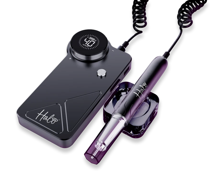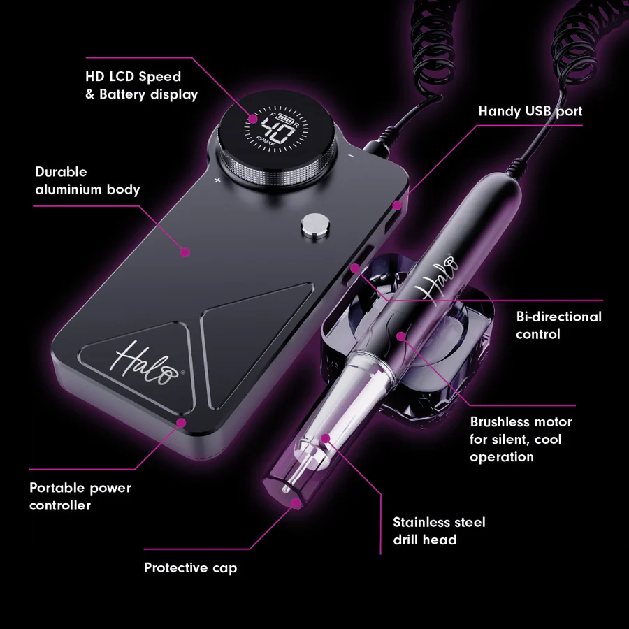 Met een behuizing van aluminiumlegering en geheel nieuwe borstelloze technologie, plus een roestvrijstalen handstuk met Japanse lagers, biedt de Halo E-File een stille, koele werking zonder trillingen en is ideaal voor zowel salon- als mobiele technici!